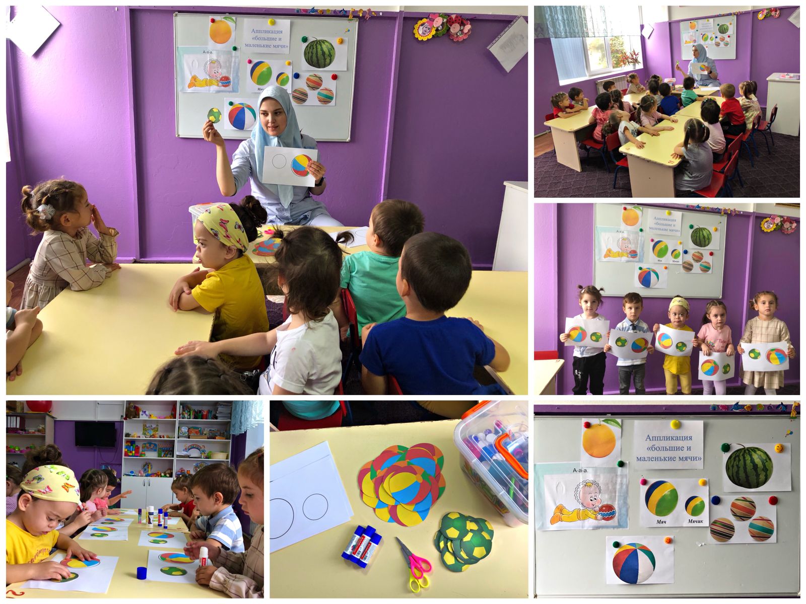 Цели: Закреплять представления о предметах круглой формы, из различии по величине, цвету. Формировать способность аккуратно наклеивать изображения.