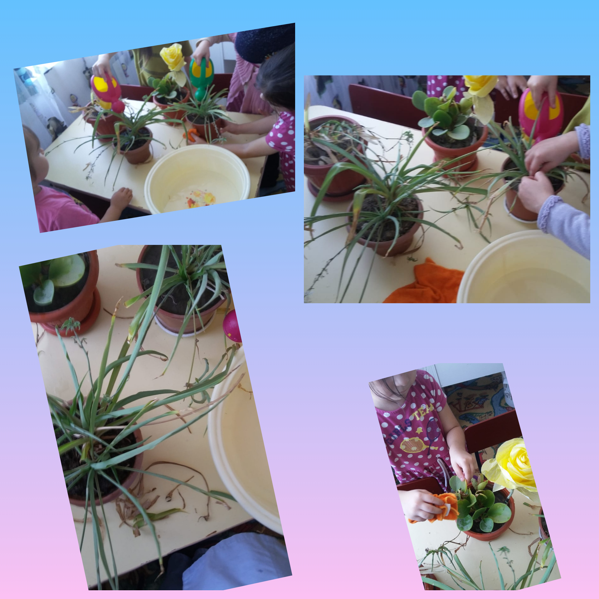 Старшпя группа "Звездочки". Трудовая деятельность: уход за комнатными растениями. Цель: прививать к труду, любовь к растениям.